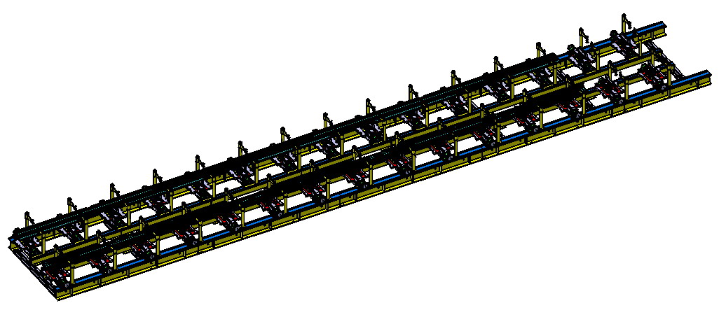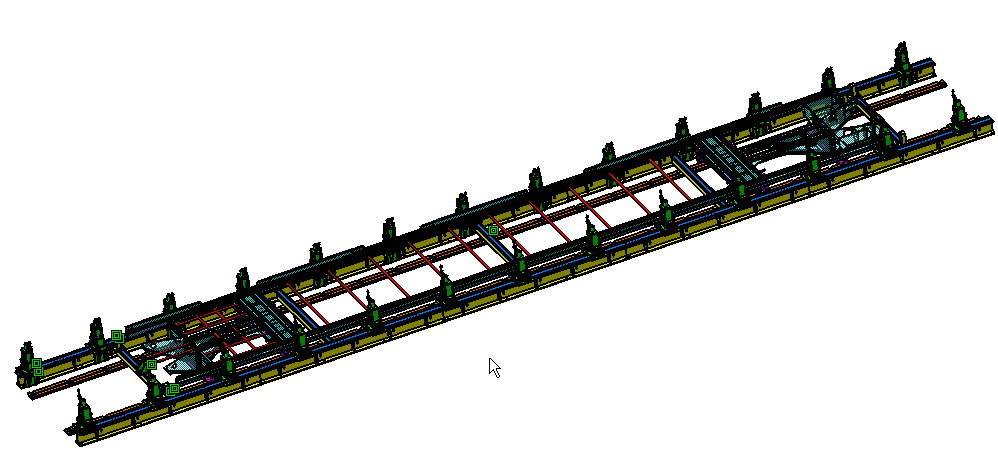 底架組裝焊接工裝主要用于將底架邊梁、長地板、端部件(牽引梁、緩沖梁、枕梁)、端梁等部件組焊成車體底架;保證底架焊后的寬度、長度、地板平面度、枕梁及車鉤面等主要形位尺寸滿足圖紙要求;實現(xiàn)底架正、反側(cè)的裝夾及焊接,需保證焊接人員和機器有足夠的操作空間,工裝用銅帶接地回流。