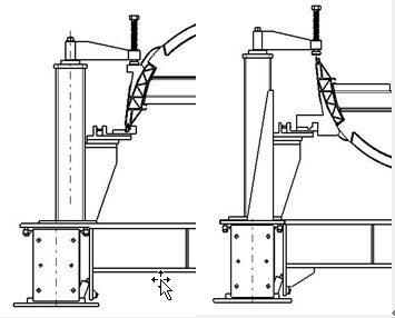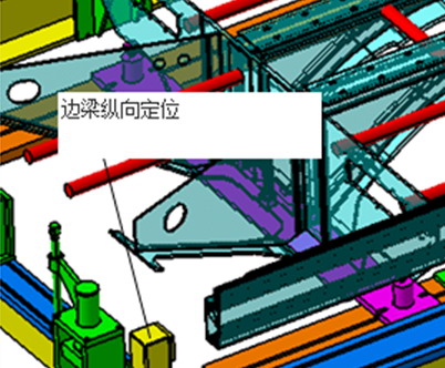 在邊梁縱向位置上,有4個定位座固定在邊梁上,同過碟式千金頂調(diào)整邊梁縱向位置,實現(xiàn)邊梁縱向定位。