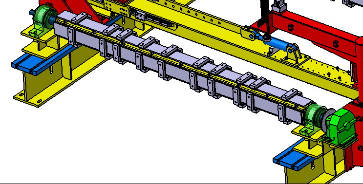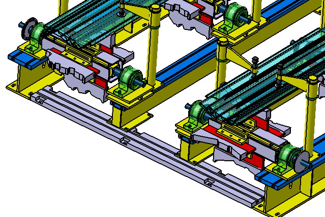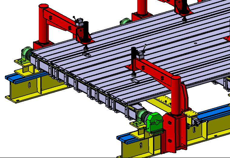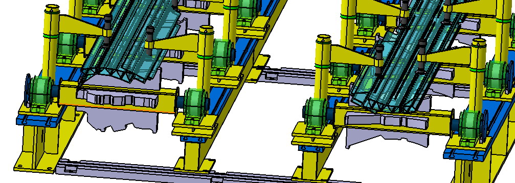 每根橫梁配置4個定位面和定位塊(尼龍材質(zhì)),定位塊配置12列(縱向長、橫向窄),采用滑動卡緊座方案,可以任意位置固定,分別適合不同項目地板(正反2個面)、空調(diào)板(正反2個面)、受電弓板(正反2個面),橫梁翻轉(zhuǎn)通過手動減速機完成,銷子固定。